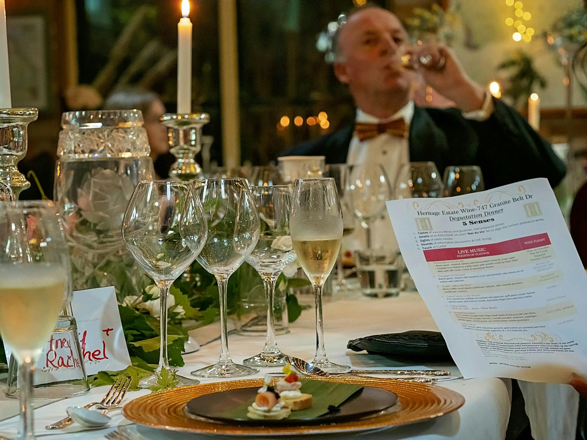 Allow four hours to delight your senses with 8-dish silver service experience presented on the second Saturday monthly; 6 pm. In the vineyard, with a glass of champagne, our viticulturist shows the vines in action. Then the tastes of 5-star Wines and chef-hatted dining, the smells of exclusive 54 scent “Nez du Vin”, sights of silent movies, sounds of a live String Quartet Ensemble, and a touch of class.